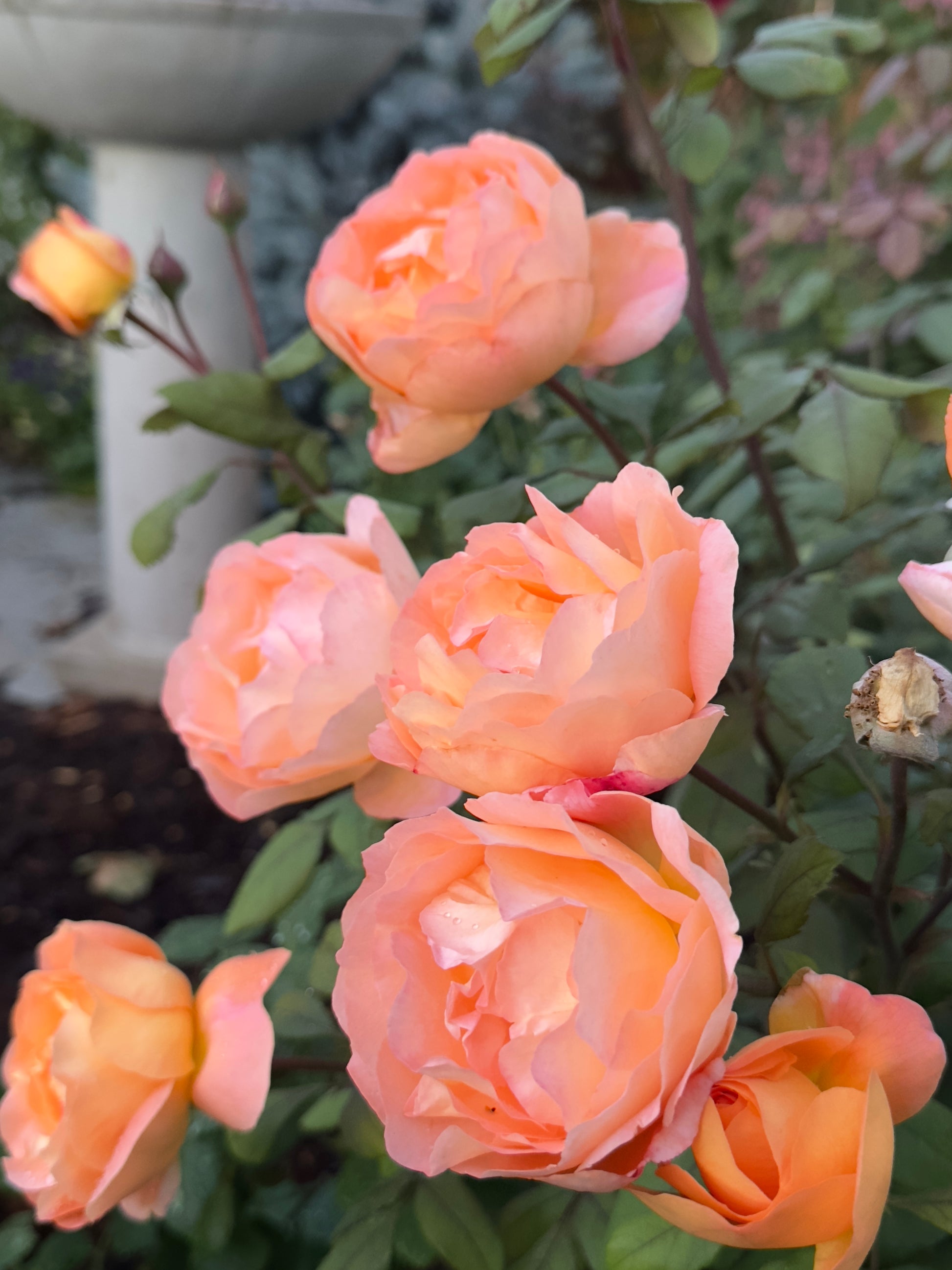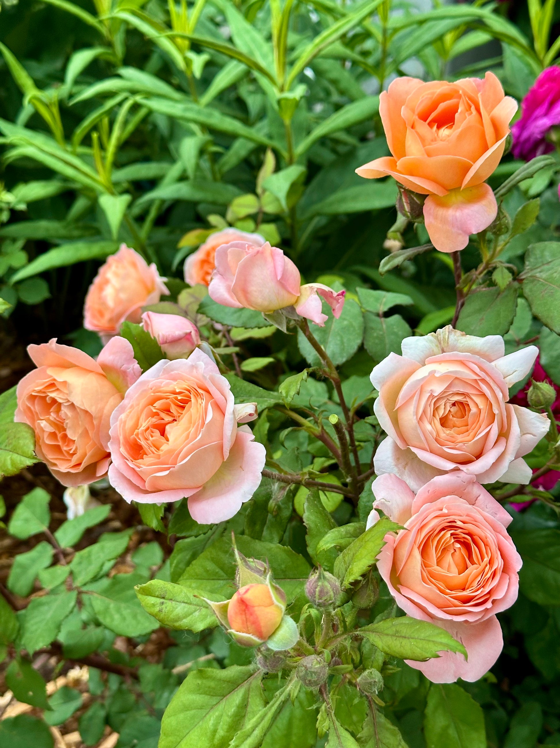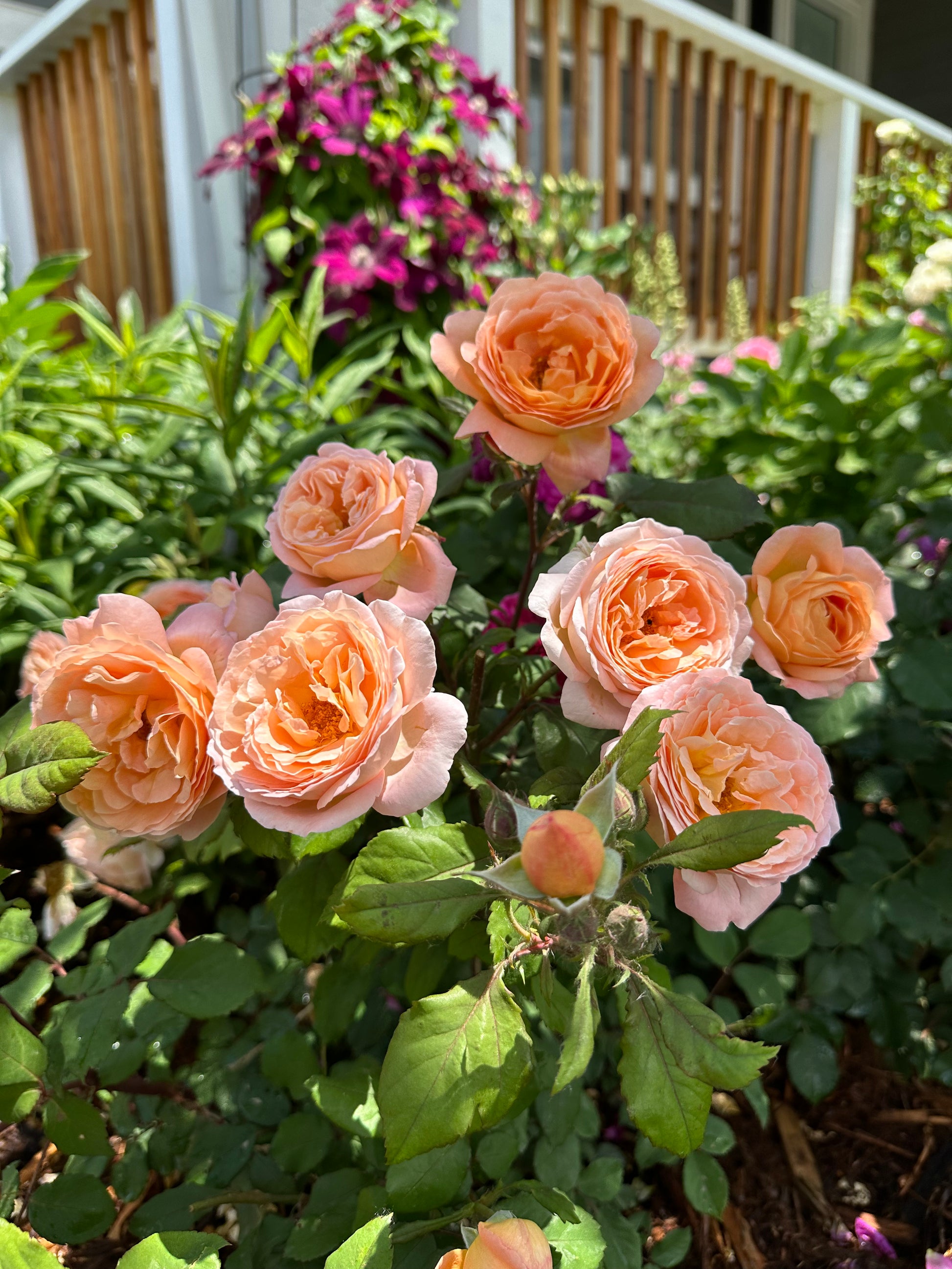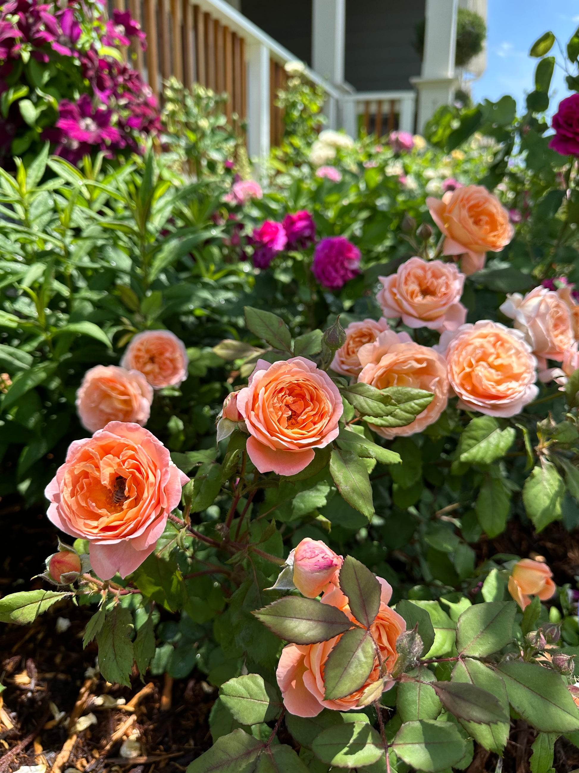 This gem is well known and loved among all David Austin rose collectors. In our garden the blooms start a beautiful peach and orange, then fades to a pretty coral and the fragrance is unmistakable. We grow three of this variety in different lighting and all of them are exceptional. It is also very loved by the bees. Almost every time I put my nose into one, I discover one to three bees inside. These photos were taken from our garden with an iPhone.