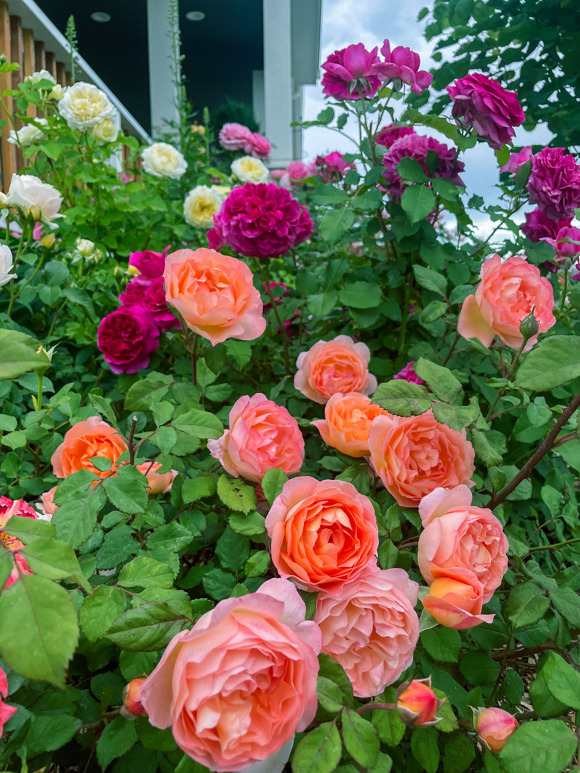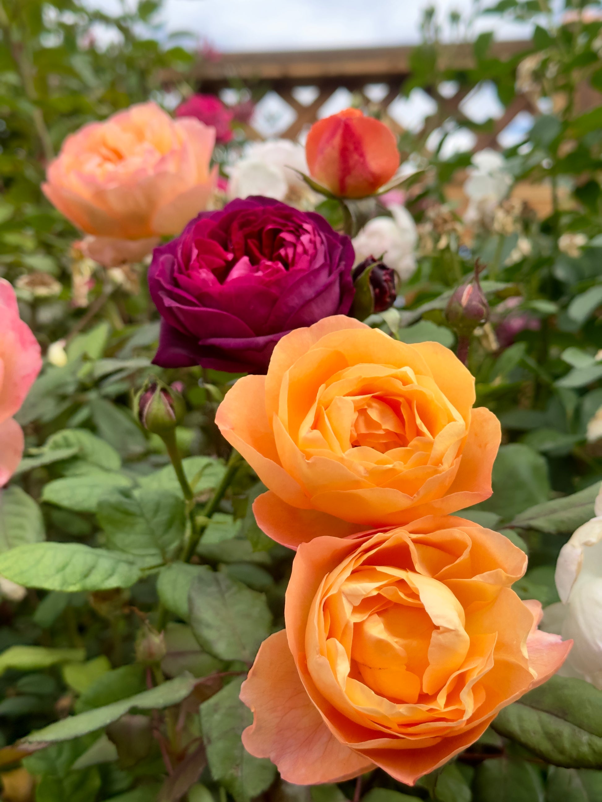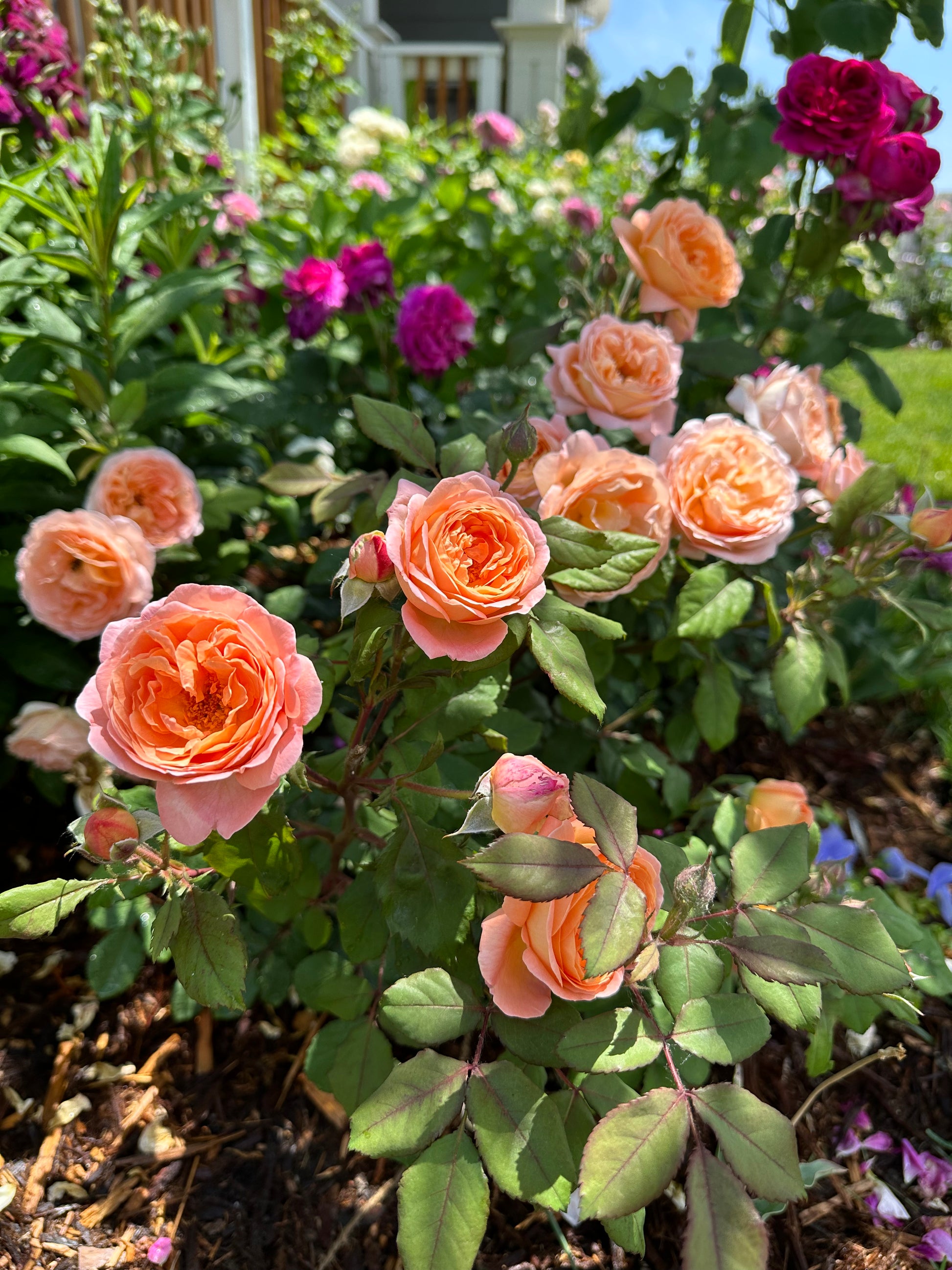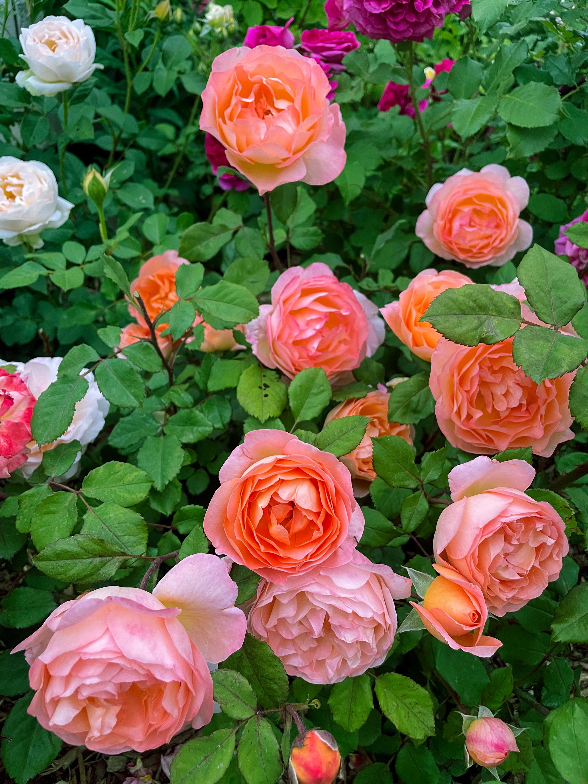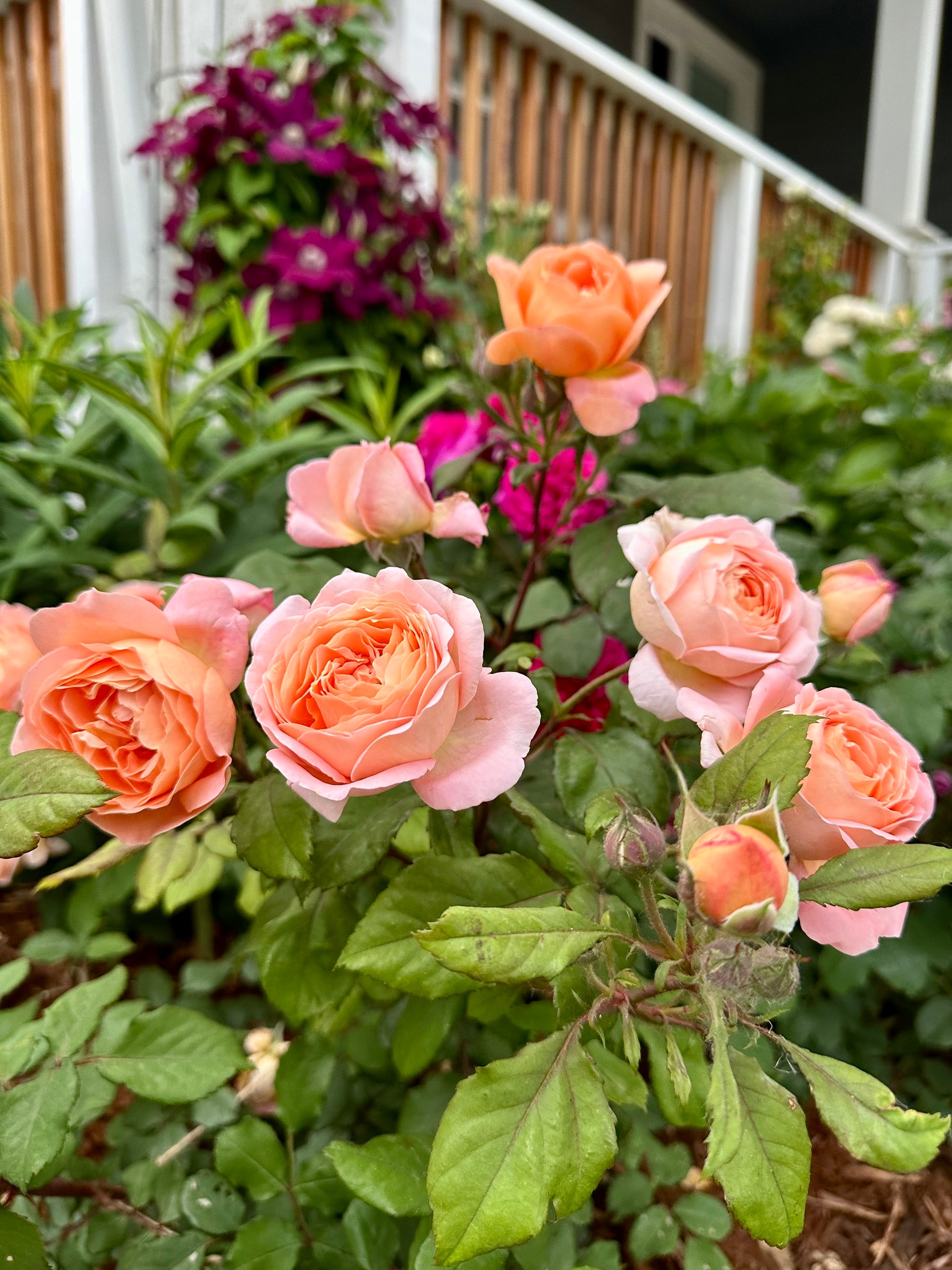 This gem is well known and loved among all David Austin rose collectors. In our garden the blooms start a beautiful peach and orange, then fades to a pretty coral and the fragrance is unmistakable. We grow three of this variety in different lighting and all of them are exceptional. It is also very loved by the bees. Almost every time I put my nose into one, I discover one to three bees inside. These photos were taken from our garden with an iPhone.