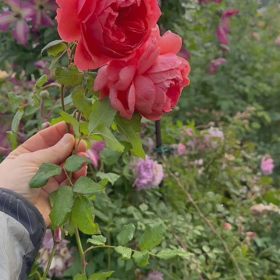 A vibrant English rose with unusual orange color that open to large, cupped blooms full of petals. Burnt orange blooms carry a strong, fruity fragrance especially when in the sun. Bred before 2004.